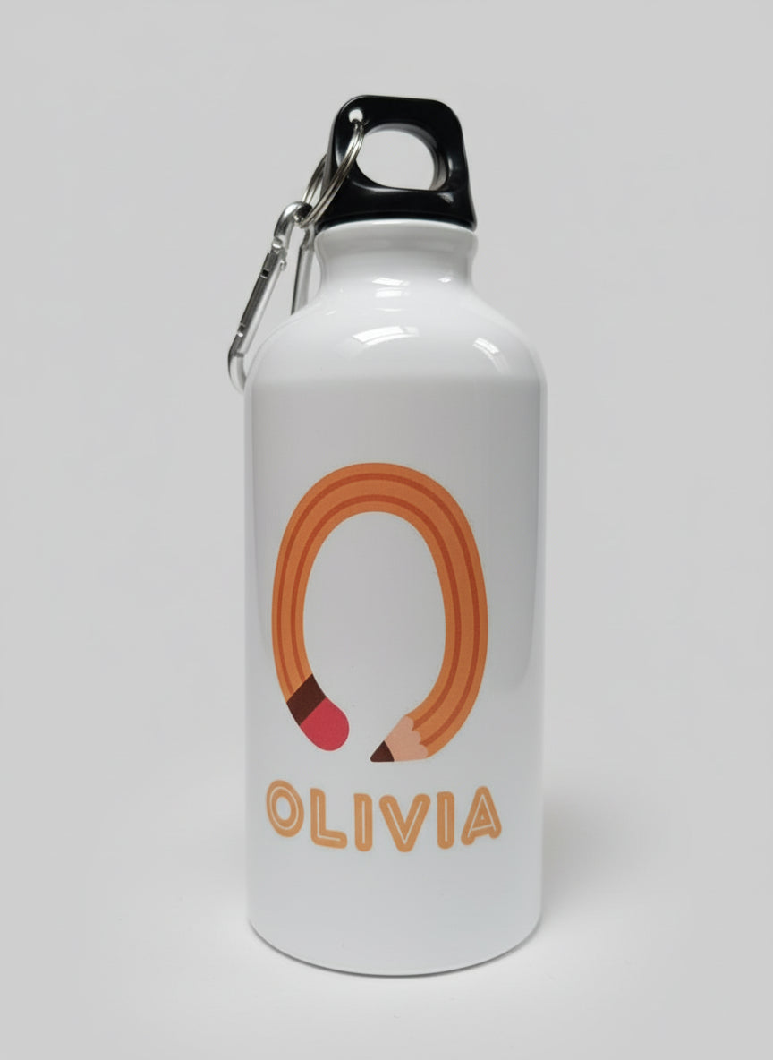 Botella de aluminio blanca con diseño infantil y nombre personalizado, perfecta para el cole, excursiones o deporte. Ligera pero resistente, con cierre de rosca y mosquetón para colgarla en la mochila.