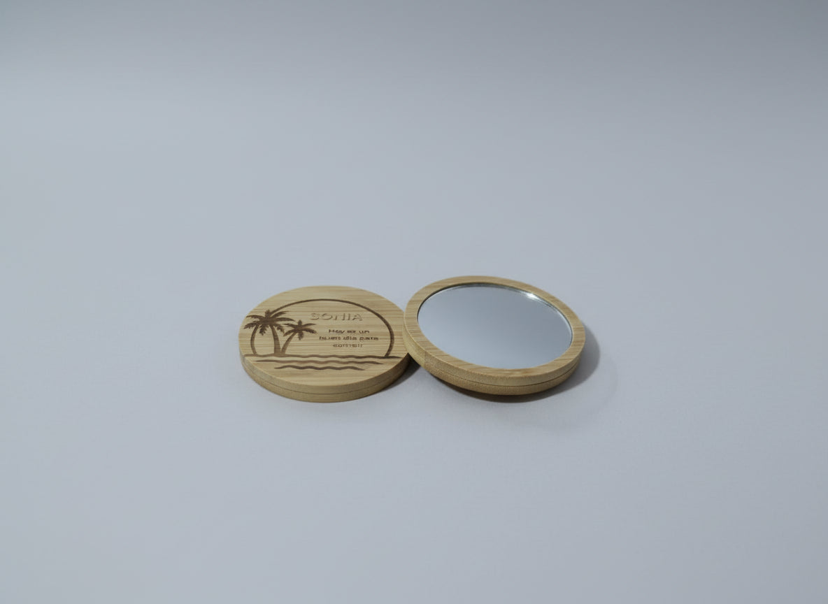 Espejo de bolso con tapa de bambú natural y grabado láser de alta definición. Un detalle elegante y sostenible para tener siempre a mano. Disponible en varios diseños y personalizable con nombre o frase corta.