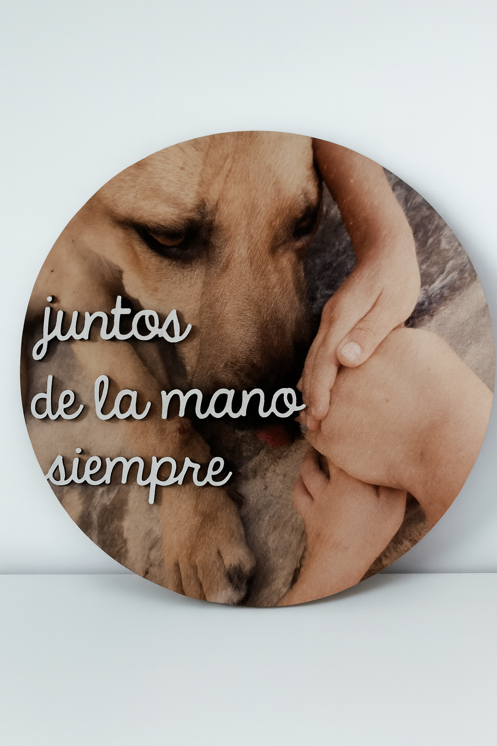 · Frase en relieve “juntos de la mano siempre” para recordar ese vínculo tan especial